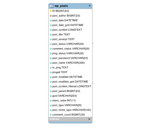المستندات والصور المرفقة (التي قد يتم إرفاقها أو لا يتم إرفاقها بمنشور) سيكون للوسائط التي تم تحميلها إلى منشور معرف هذا المنشور في حقل post_parent الخاص به. الصور التي يتم تحميلها عبر شاشة الوسائط في لوحة المعلومات سيكون لها هذا الحقل فارغًا. يتم استخدام حقل الدليل لتخزين عنوان URL لملف الوسائط.