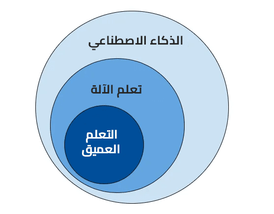 توضح الصورة التالية العلاقة بين الذكاء الاصطناعي Artificial Intelligence وتعلم الآلة Machine Learning والتعلم العميق Deep Learning.