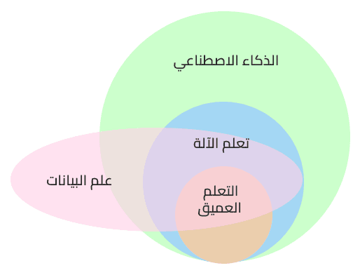 أما الصورة التالية، فستستطيع من خلالها فهم الترابط والتداخل بين علم البيانات Data Science وعلوم الذكاء الاصطناعي المختلفة.