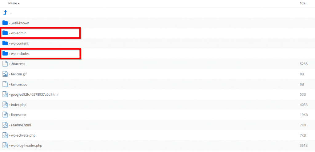 بعد تسجيل الدخول الى ملفات الموقع عن طريق تطبيق FileZilla أو مدير الملفات في الإستضافة نقوم بحذف كل من ملف (wp-includes) وملف (wp-admin) والتأكد من عدم حذف ملف (wp-content) الذي يحتوي على محتوى موقعك الإلكتروني من صفحات ومقالات وقوالب وإضافات.