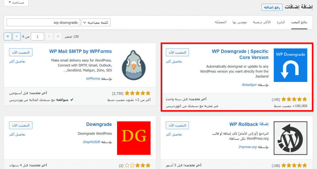 للبدء في استخدام اضافة (WP Downgrade) تقوم بالانتقال الي تبويب الاضافات في ووردبريس والبحث عن اضافة (WP Downgrade) ومن ثم تثبيتها وتفعيلها على الموقع.
