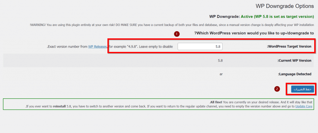 بعد ذلك نقوم بالمتابعة عن طريق النقر على زر حفظ التغييرات الموجود في اسفل الصفحة وسوف تقوم الإضافة الان بتحميل الإصدار المحدد من الووردبريس وتثبيته على موقعك الإلكتروني.